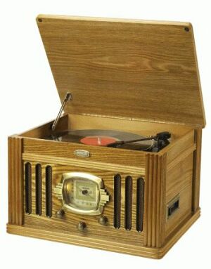 The vintage 1940's era Grand Music Center table top replica phonograph has an antique style illuminated airplane dial with a deco face and antique knobs. This nostalgic beauty features an AM/FM radio, 3 speed turntable record player and a side mounted cassette player. Click Here to see it in Cherry.