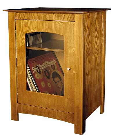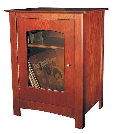 features knock-down construction, a wooden drawer and shelf for record storage.